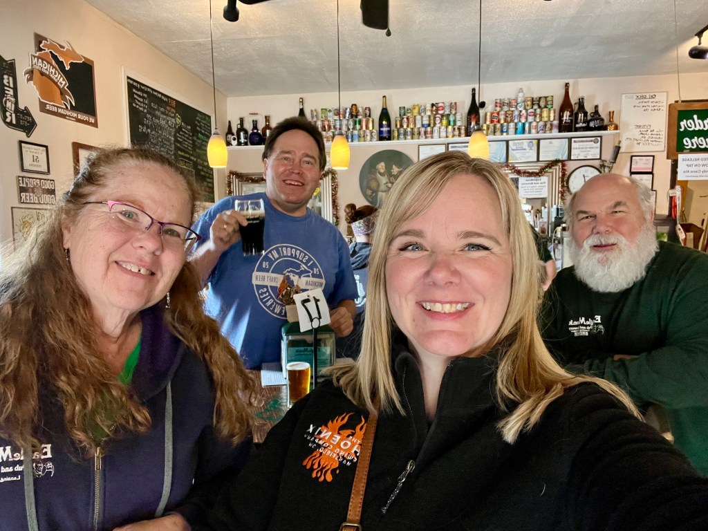 While we were impressed by the mugs all around, we especially enjoyed visiting and hanging out with Dan and Sonia Buonodono, the owners of EagleMonk. All of the delicious beers are brewed by Dan and have been since EagleMonk opened twelve years ago. Dan, like many brewers/brewery owners, began as a home brewer where he honed his brewing skills before opening his own place. Sonia runs the front of the house, coordinating rotating art shows from local Lansing artists, live original music, and a variety of group meet ups such as a Knitting/Crochet/Cross Stitch/Craft night and weekly Bingo. There’s a little something for everyone! We were so happy to spend time with them and hear their stories. I’ve said it before, and I will say it again and again – the relationships that we make through TagaBrew mean so much to us!