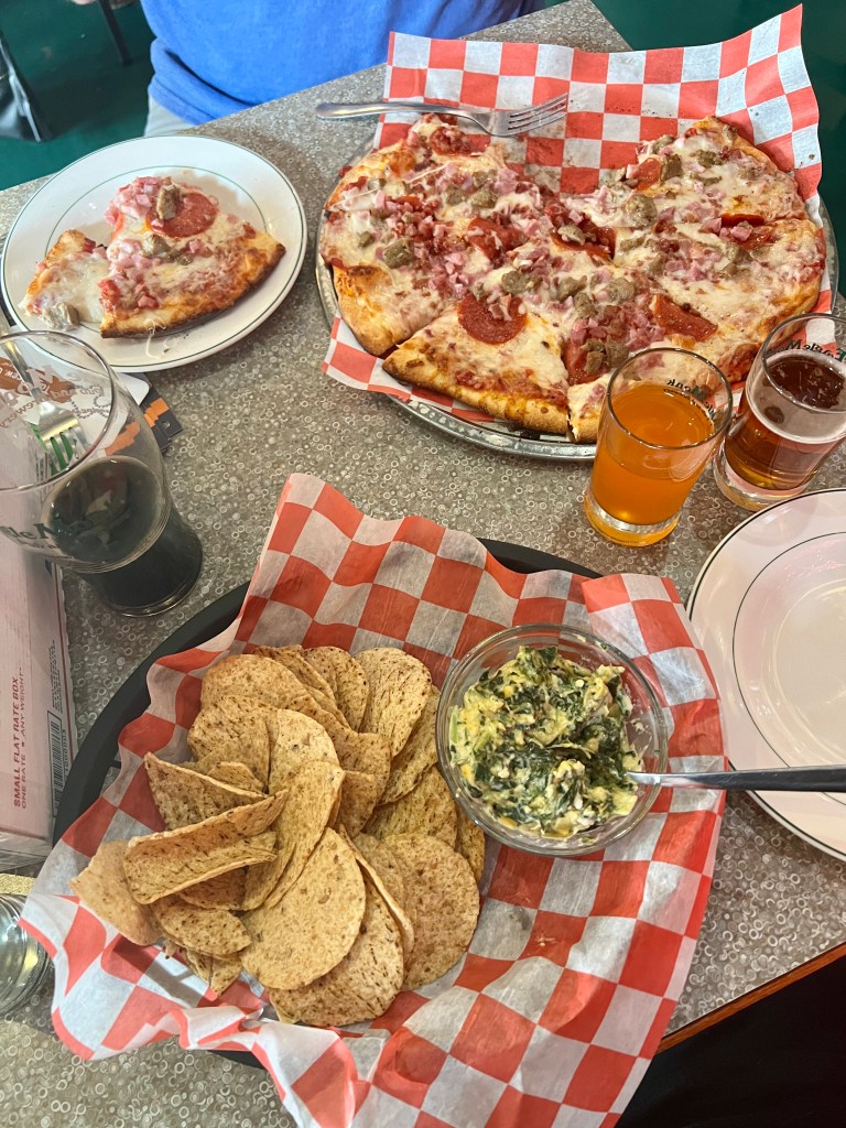 Russ and I both sampled some of the brews on tap, and I really enjoyed the Irish red ale. Something else that I thought is cool about EagleMonk is that they make their own sodas and have four taps on the side of the little fridge. Dan brought me some cream and orange sodas that I promptly mixed to make a creamsicle drink to go with my food…oh yes, that’s right they also have food. It’s not just any old food either, but honest to goodness homemade, delicious food! I scarfed down the spinach and artichoke dip and chips while Russ noshed on a personal pizza. Later that day, I found myself wishing I had brought an order of that dip home with me – it was THAT good!